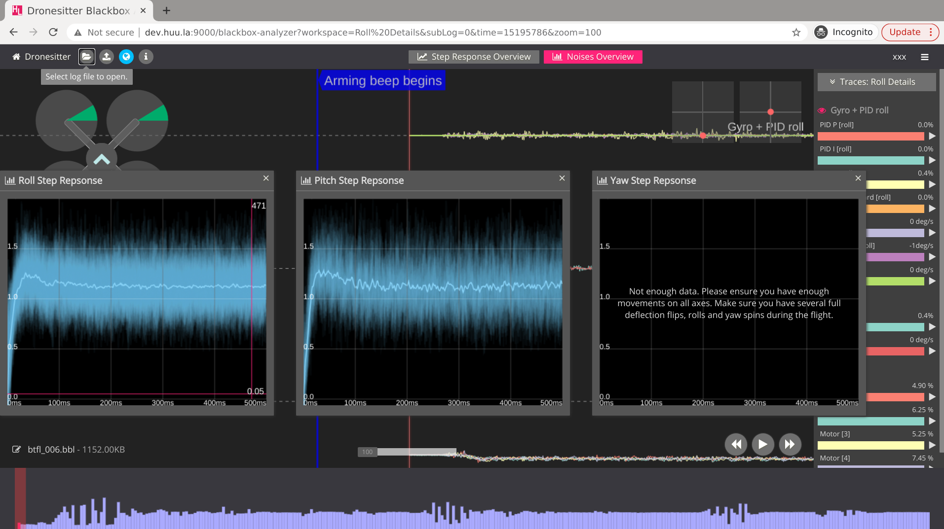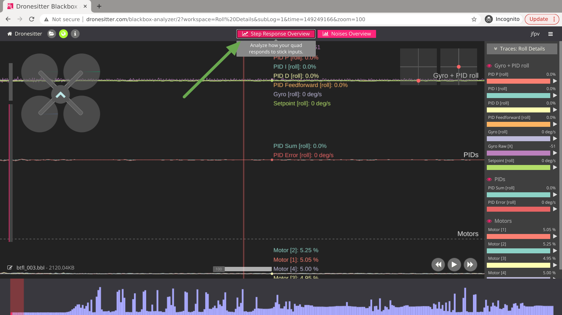 Click on the "Step Response Overview" button at the top. In 1 or 2 seconds, it should generate the step response graph for all ROLL, PITCH, YAW axes.
