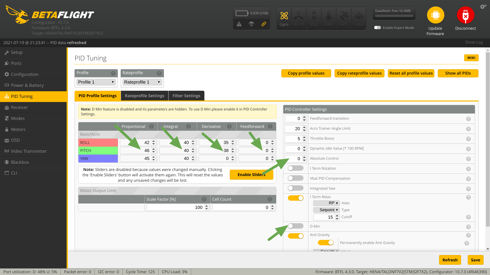 Once you find the perfect P/D balance, you can increase P and D up with the ratio kept until you get oscillations. This is then the perfect value for P and D.[3] This step makes sure your quad can resist disturbances well. We'll get into more details on this in later tutorials.